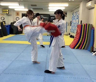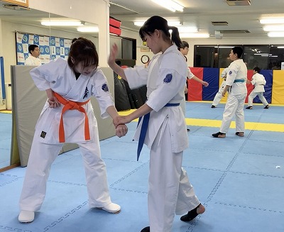 対人では、護身技で掌底の使い方を練習