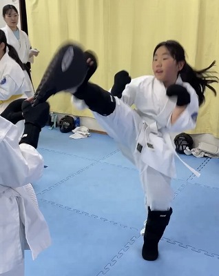 指導員との組手でも中段回し蹴りを
